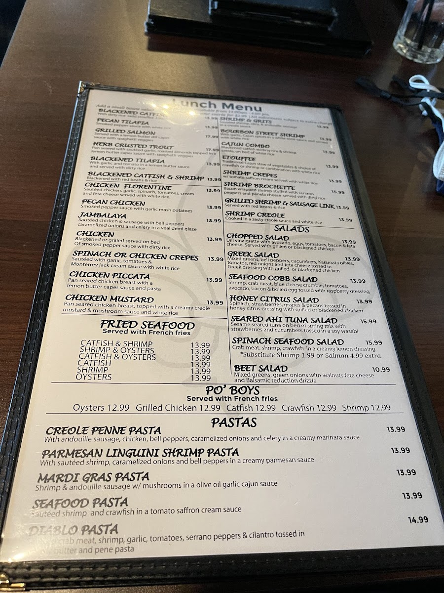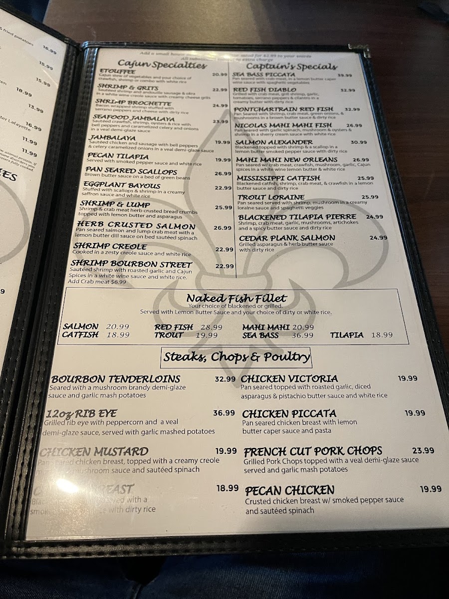 Blackened catfish, shrimp, crab meat, & crawfish in a lemon butter sauce and dirty rice.